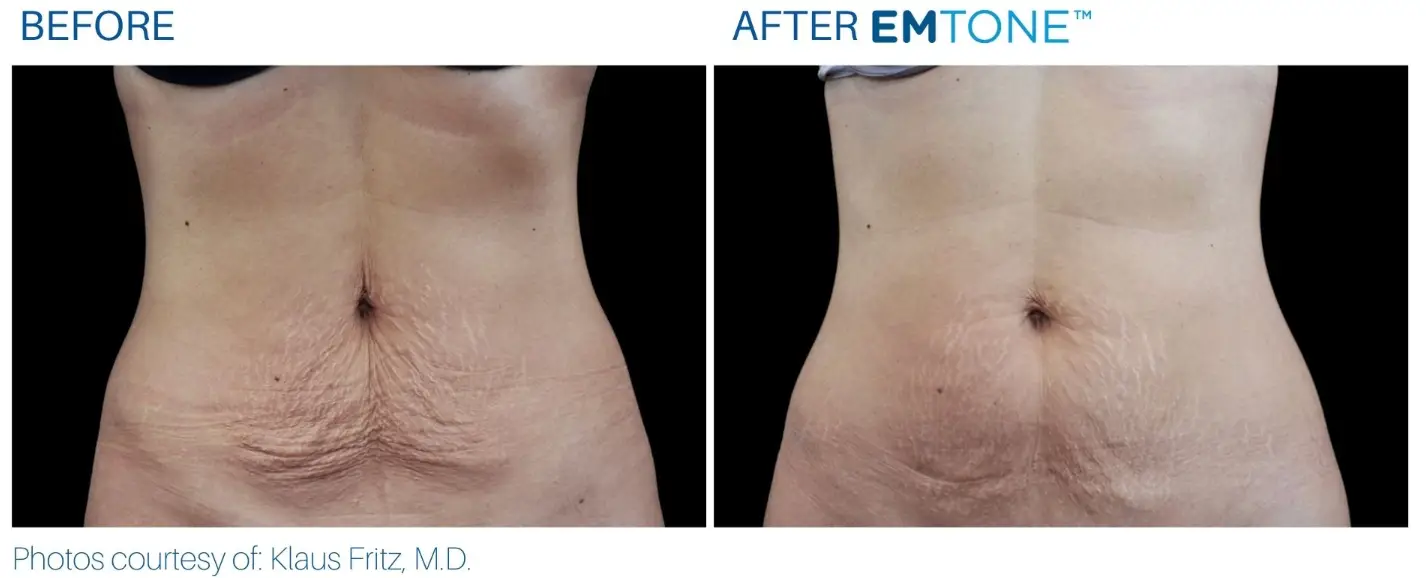 EMTONE is a non-invasive treatment that simultaneously delivers mechanical and thermal energy using radiofrequency (RF) and targeted pressure energy (TPE) to treat and reduce cellulite alongside improving skin tone and texture and tightening loose or lax skin.
